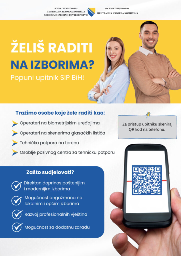 Radi preliminarne procjene raspoloživosti i kapaciteta tehničkog kadra za angažman u izbornoj administraciji Bosne i Hercegovine, Središnje izborno povjerenstvo BiH je pripremilo upitnik za iskazivanje interesa za rad na poslovima operatera na biometrijskim uređajima za identifikaciju birača i optičkim skenerima glasačkih listića, tehničara terenske podrške na dan izbora, te službenika u pozivnom centru za pružanje potpore operaterima i terenskim tehničarima.